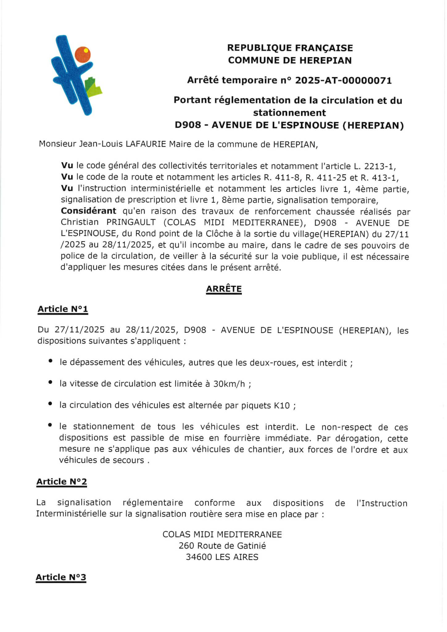 Accueil » Actualité » Arrêté municipal de circulation et stationnement – D908 avenue de l’Espinouse – du 27.11.2025 au 28.11.2025