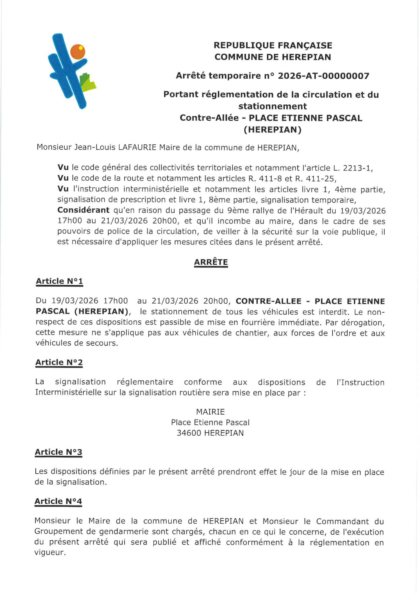 Accueil » Actualité » Arrêté municipal temporaire portant réglementation de la circulation et du stationnement – Contre-Allée Place Etienne Pascal – du 19.03.2026 à 17h00 au 21.03.2026 à 20h00