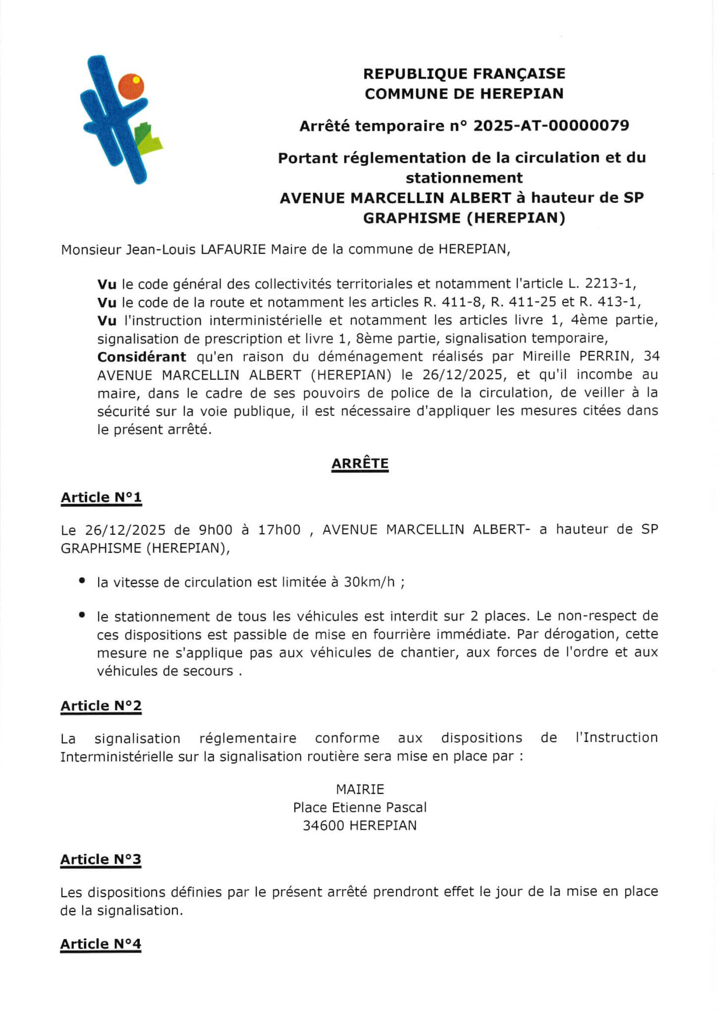 Arrêté temporaire de circulation et de stationnement – Samedi 26.12.2025 – Avenue Marcellin Albert (hauteur SP Graphisme)