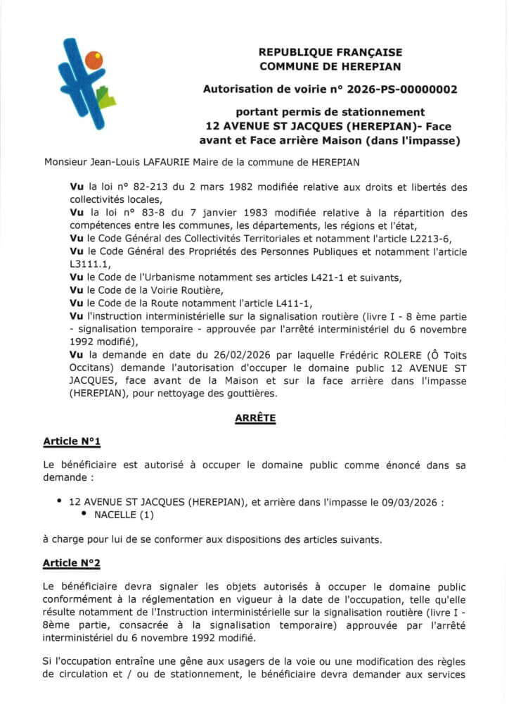 Autorisation de voirie – 12 avenue Saint Jacques – Lundi 9 Mars 2026