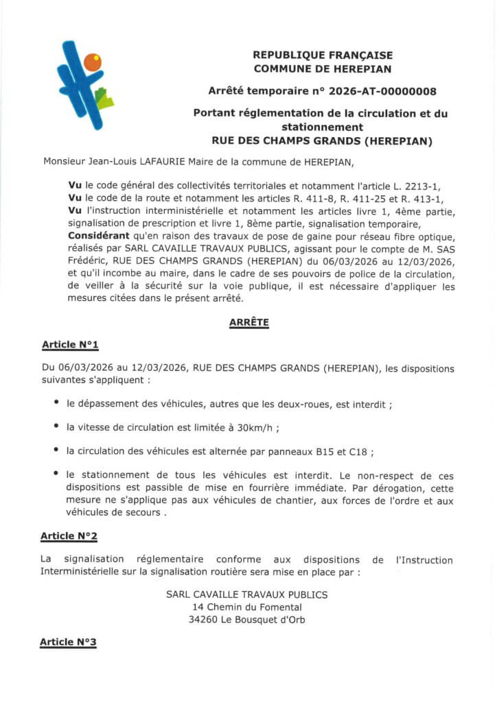 Arrêté temporaire de circulation et de stationnement – Rue des Champs Grands – du 06.03 au 12.03.2026