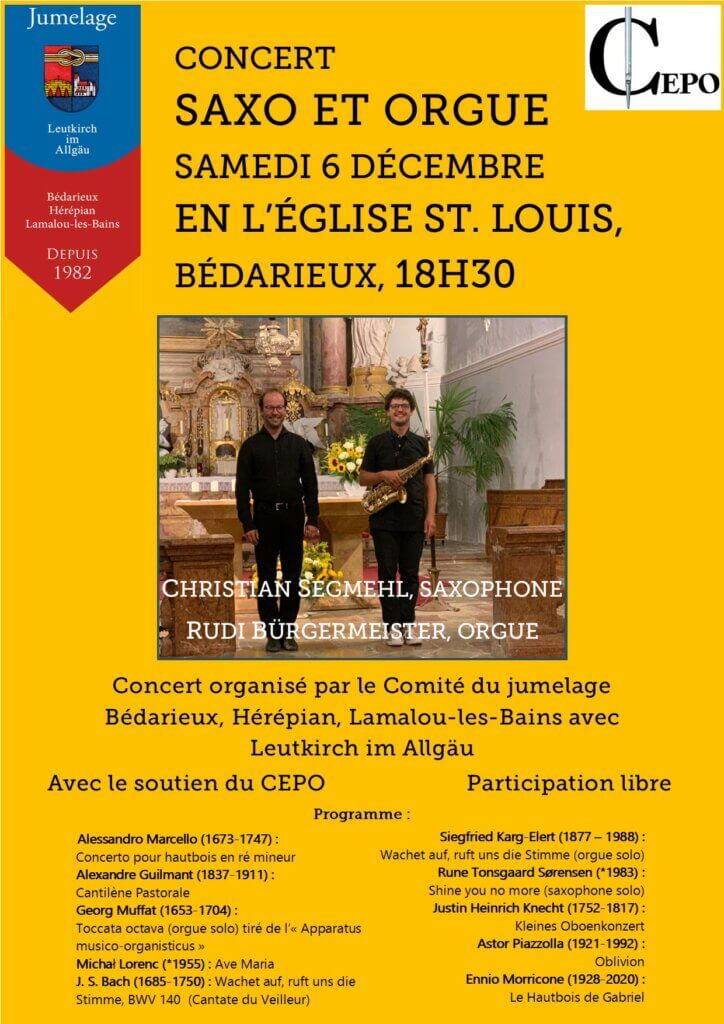 Christian Segmehl, saxophoniste talentueux habitant à Leutkirch im Allgäu, revient à Bédarieux pour un concert de saxophone et orgue en l’église St. Louis le 6 décembre. Au programme, un mix éclectique de musiques allant de J. S. Bach à Enrico Morricone. C’est la quatrième fois que Christian se produit à Bédarieux, la dernière fois en […]