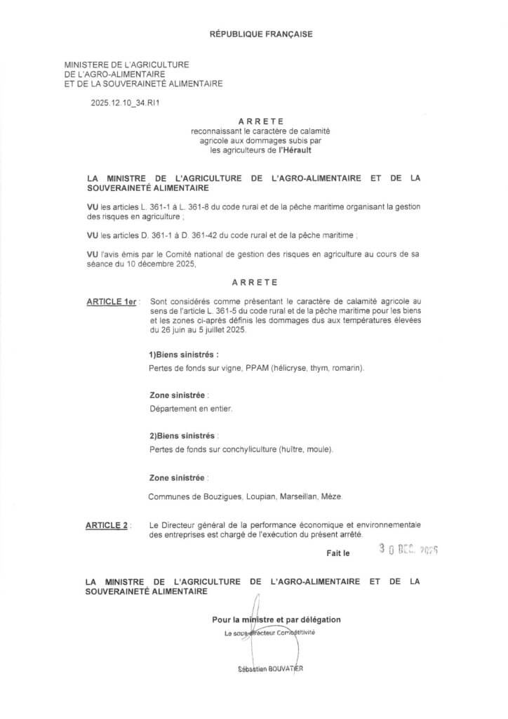 Le Comité national de gestion des risques en agriculture réuni le 10 décembre 2025 a reconnu le caractère de calamité agricole pour les dommages liés aux températures élevées du 26 juin au 5 juillet 2025. L’arrêté ministériel du 30 décembre 2025 porte reconnaissance du caractère de calamité agricole aux dommages subis par les agriculteurs de […]