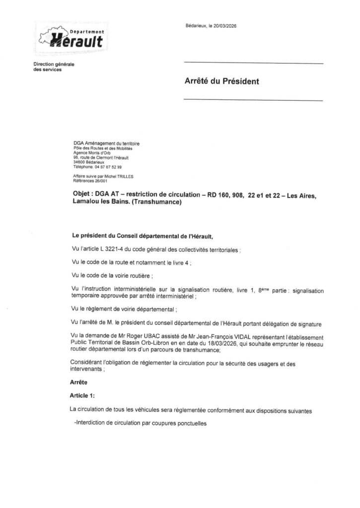 Arrêté de restriction de circulation (transhumance) – Les Aires – Lamalou les Bains – 30.03.2026