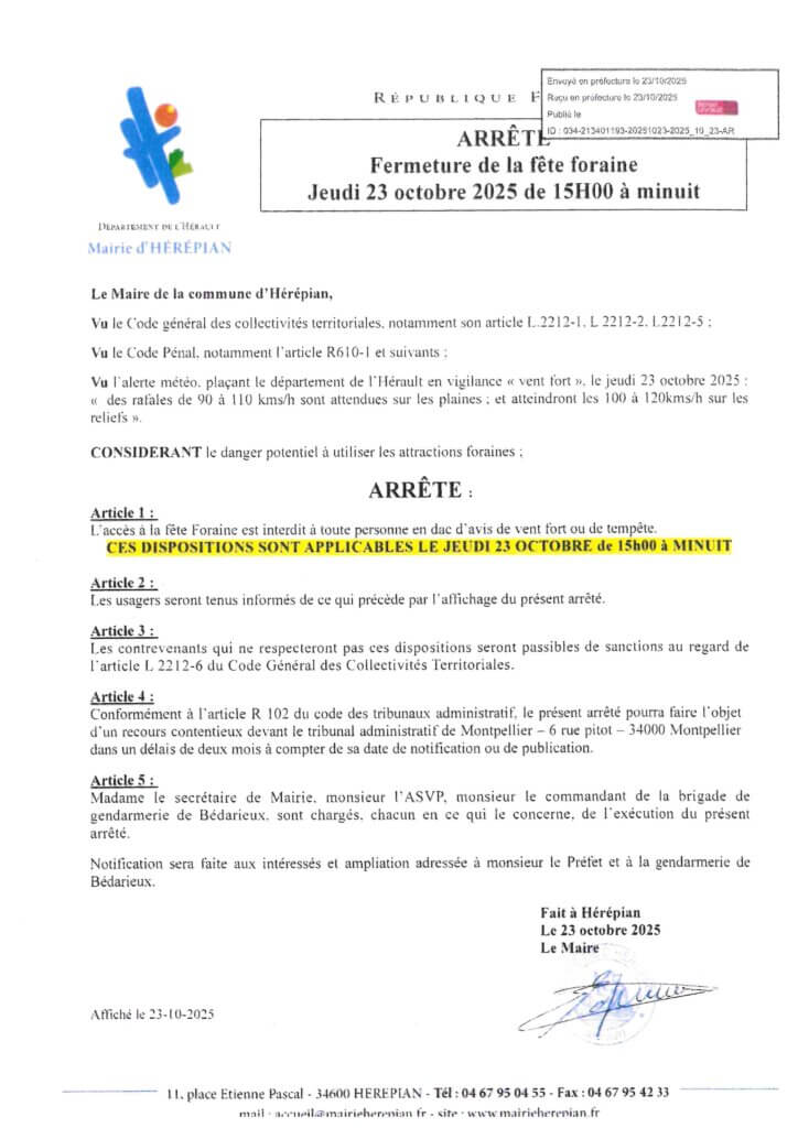 En raison de l’alerte jaune pour vents violents émise par Météo-France, la fête foraine sera exceptionnellement fermée aujourd’hui pour des raisons de sécurité.Merci de votre compréhension.