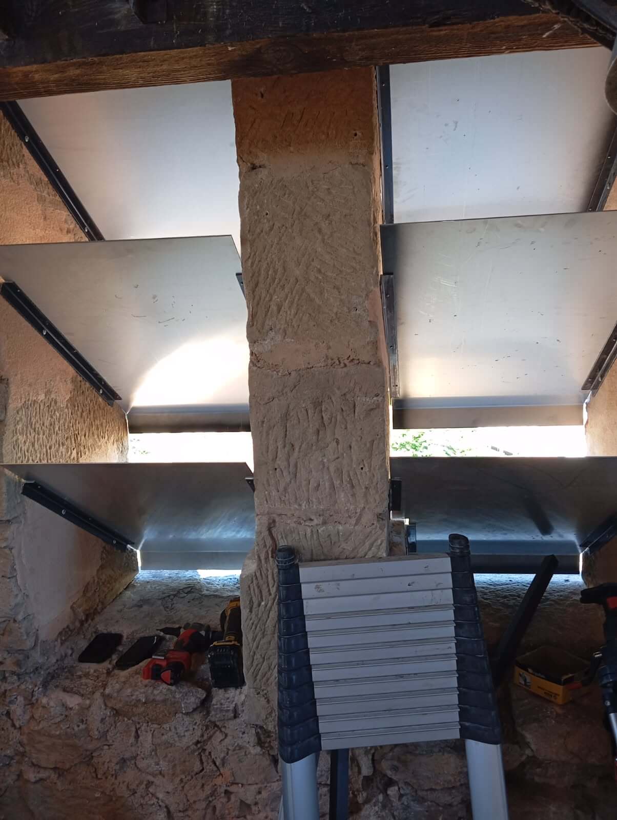 Les anciens abat-sons, usés par le temps et les intempéries, ne remplissaient plus pleinement leur fonction. Ces structures en bois, placées à l’ouverture des baies du clocher, permettent non seulement de canaliser et amplifier le son des cloches, mais aussi de protéger l’intérieur du clocher contre la pluie et le vent.