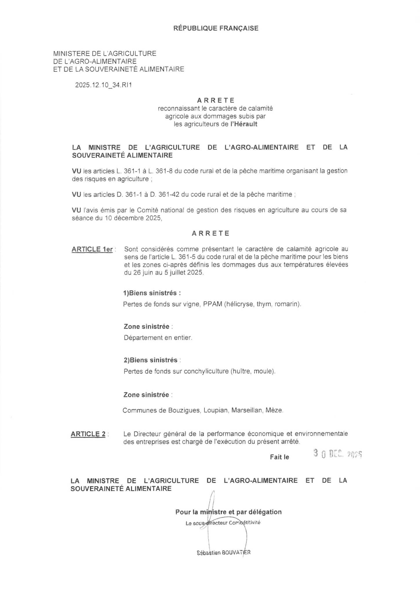 L’arrêté ministériel du 30 décembre 2025 porte reconnaissance du caractère de calamité agricole aux dommages subis par les agriculteurs de l’Hérault.