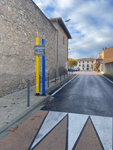 Ces jolis crayons géants portant le message « Attention à nos Enfants » attirent le regard tout en apportant une touche ludique à notre village.